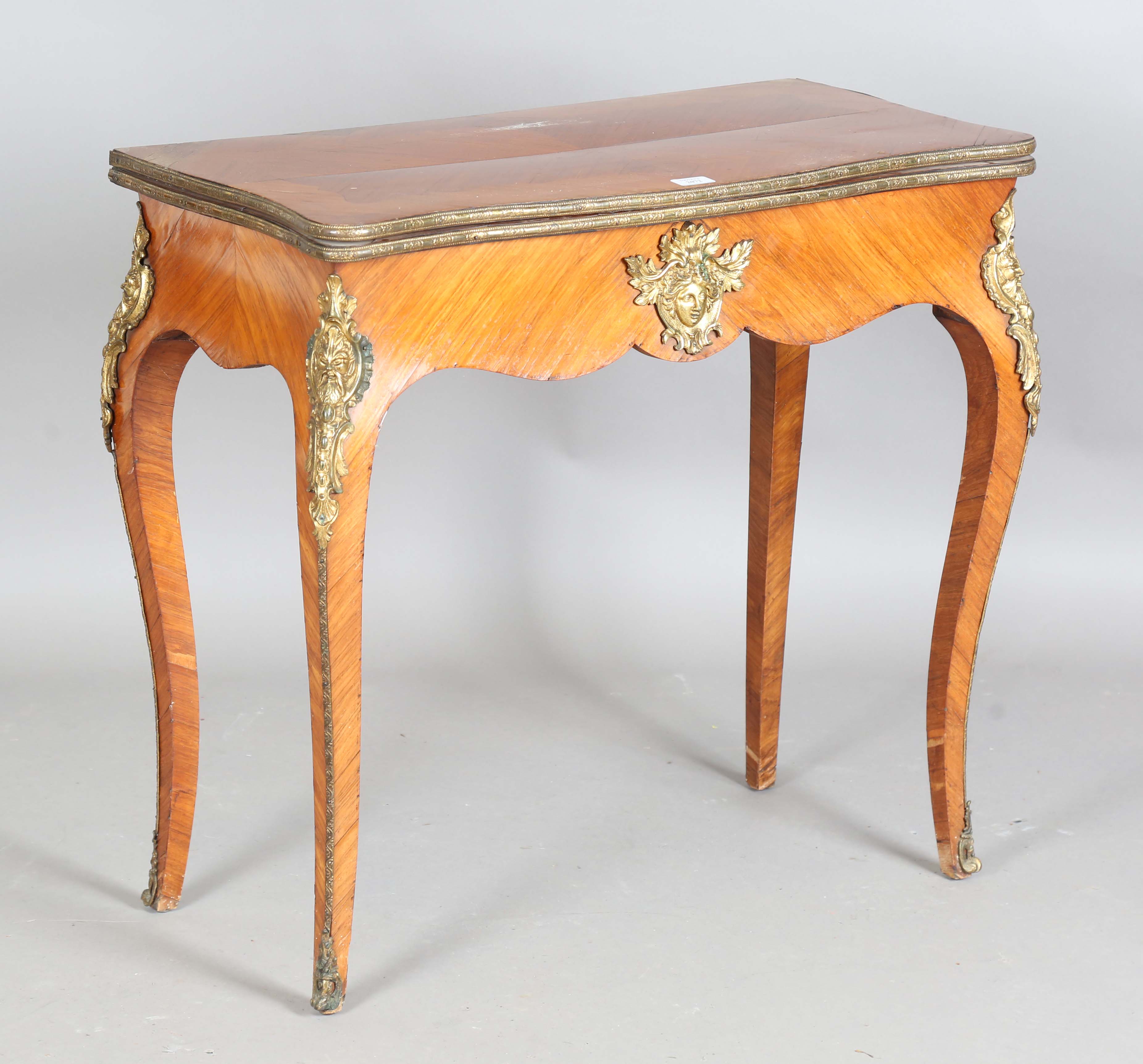 A 19th century Rococo Revival kingwood and gilt metal mounted fold-over card table, height 75cm, width 80cm, depth 40cm.