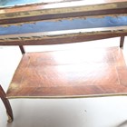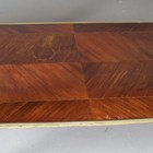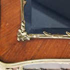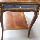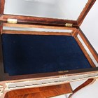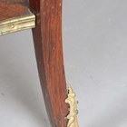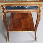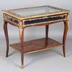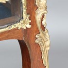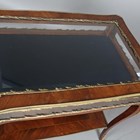An early 20th century French walnut and gilt metal mounted bijouterie table, the hinged top above glazed sides, on cabriole legs united by an undertier, height 77cm, width 90cm, depth 60cm.