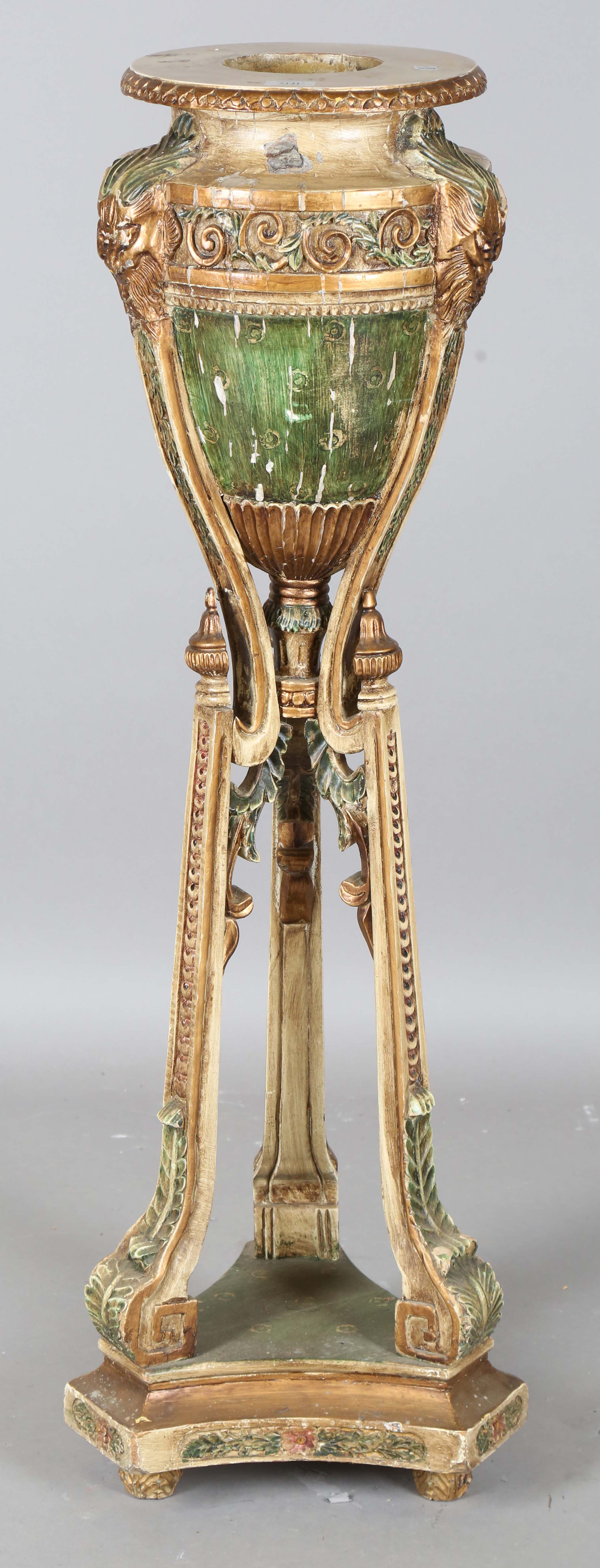 A 20th century Italianate painted and carved softwood stand of classical urn form, raised on shaped tripod supports, height 122cm, width 42cm.