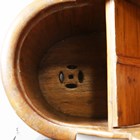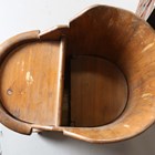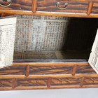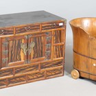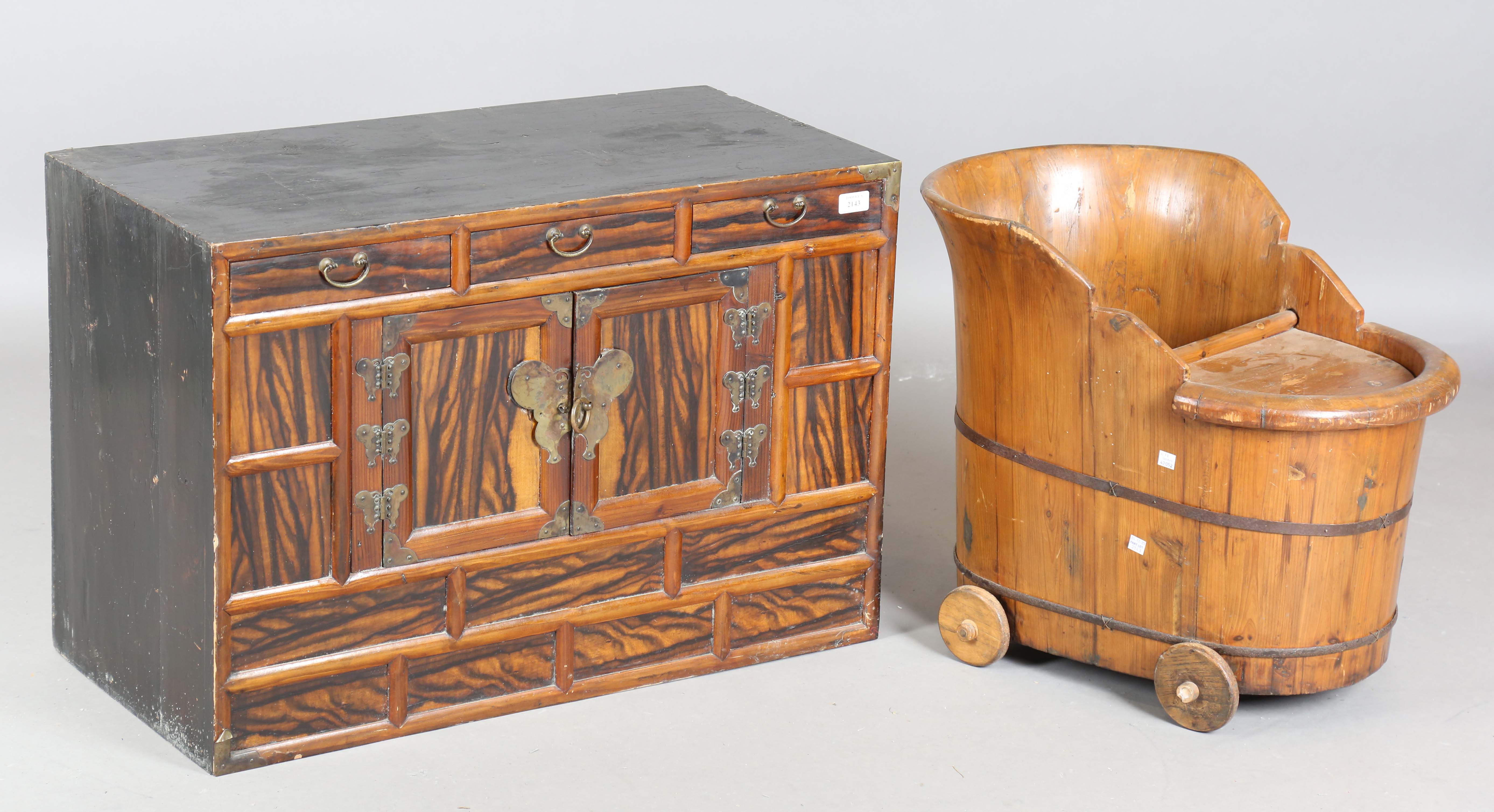 A Korean softwood cabinet, fitted with a pair of doors and three drawers, height 55cm, width 80cm, depth 40cm, together with a Chinese softwood infant's cart, height 52cm, width 60cm.