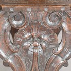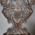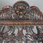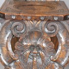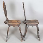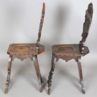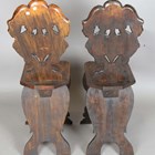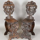 A pair of 19th century Italian sgabello type walnut hall chairs, carved with masks, herms and scrolls, height 100cm, width 32cm, depth 40cm.