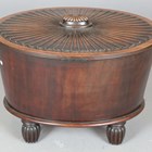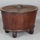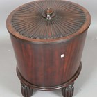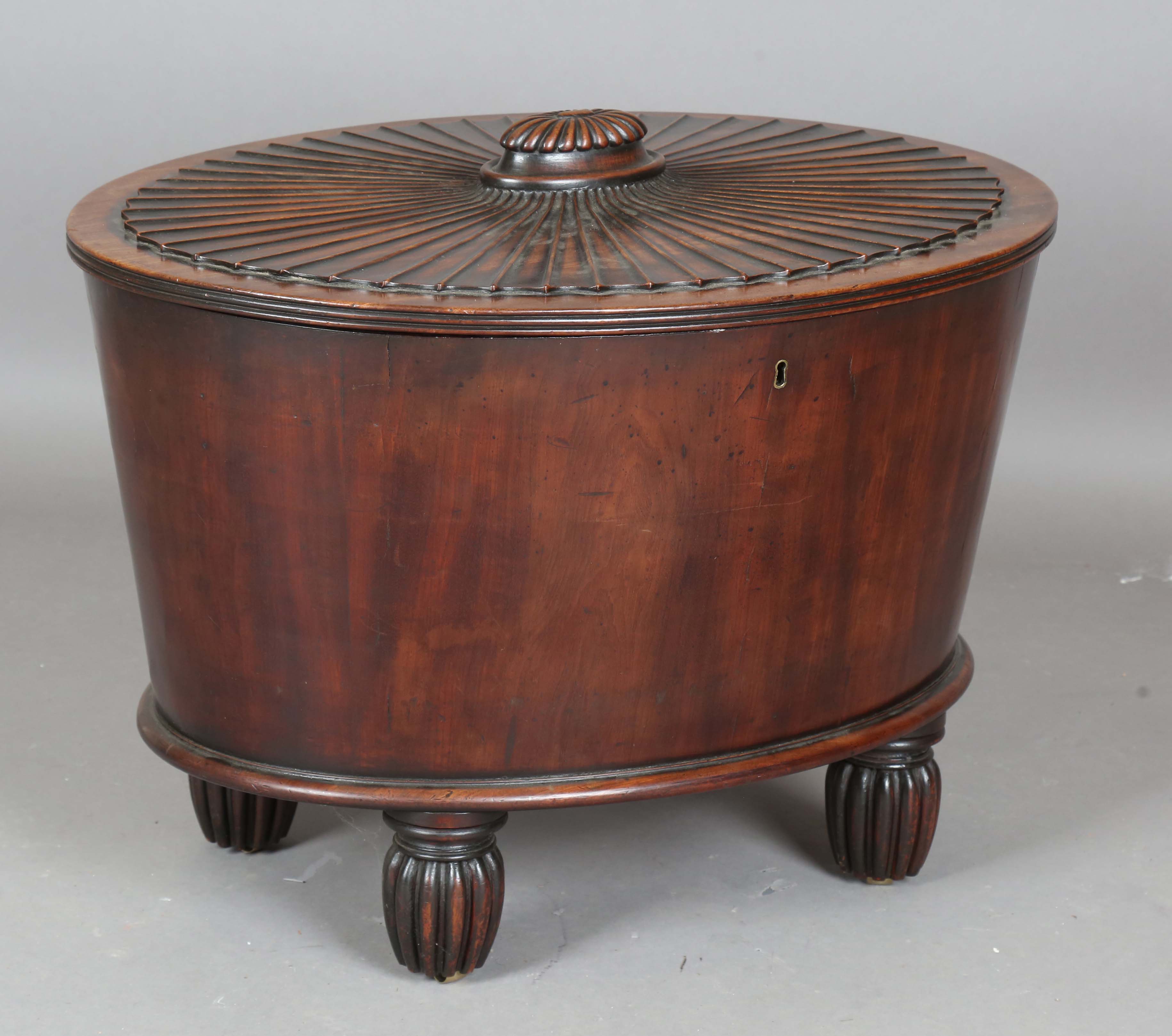A Regency mahogany oval wine cooler by Gillows of Lancaster, the hinged lid carved with a reeded finial and fan patera, raised on reeded feet and castors, height 58cm, width 76cm, depth 57cm.