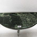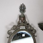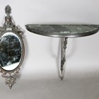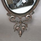 A late 20th century patinated cast metal marble-topped console table, height 49cm, width 63cm, together with an associated oval wall mirror, height 70cm, width 25cm.
