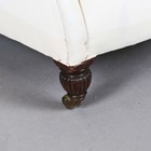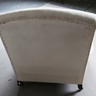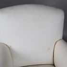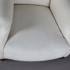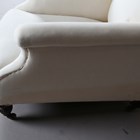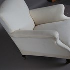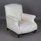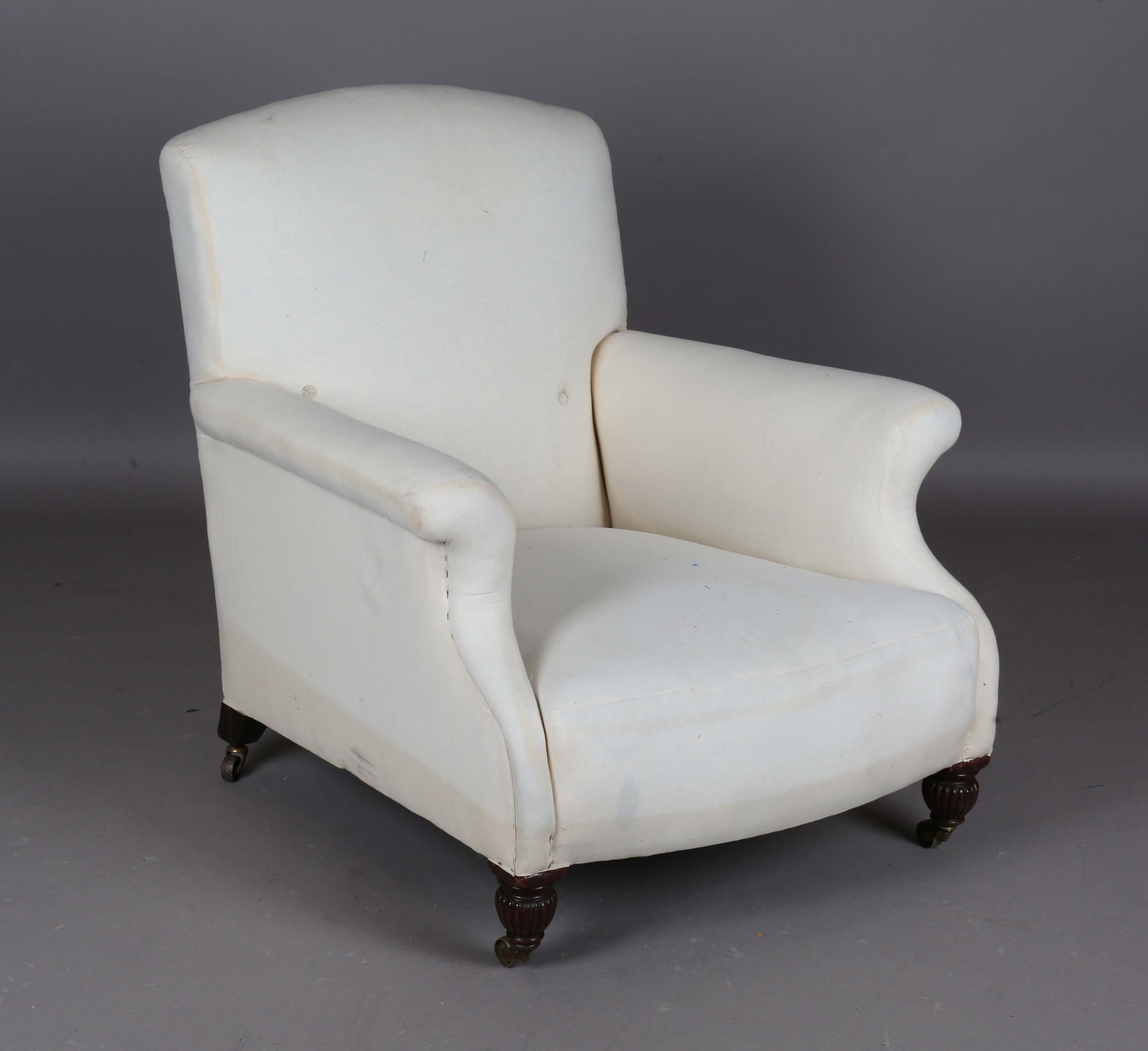 A late Victorian deep seated armchair, in the manner of Howard & Sons, raised on reeded feet and castors, bearing stamped registration number to rear leg, height 87cm, width 83cm, depth 95cm.