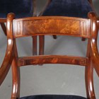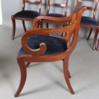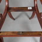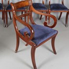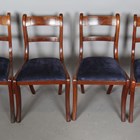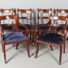 A set of six Regency mahogany dining chairs with brass inlaid bar backs, comprising two carvers, height 84cm, width 56cm, and four standards, height 85cm, width 48cm.
