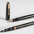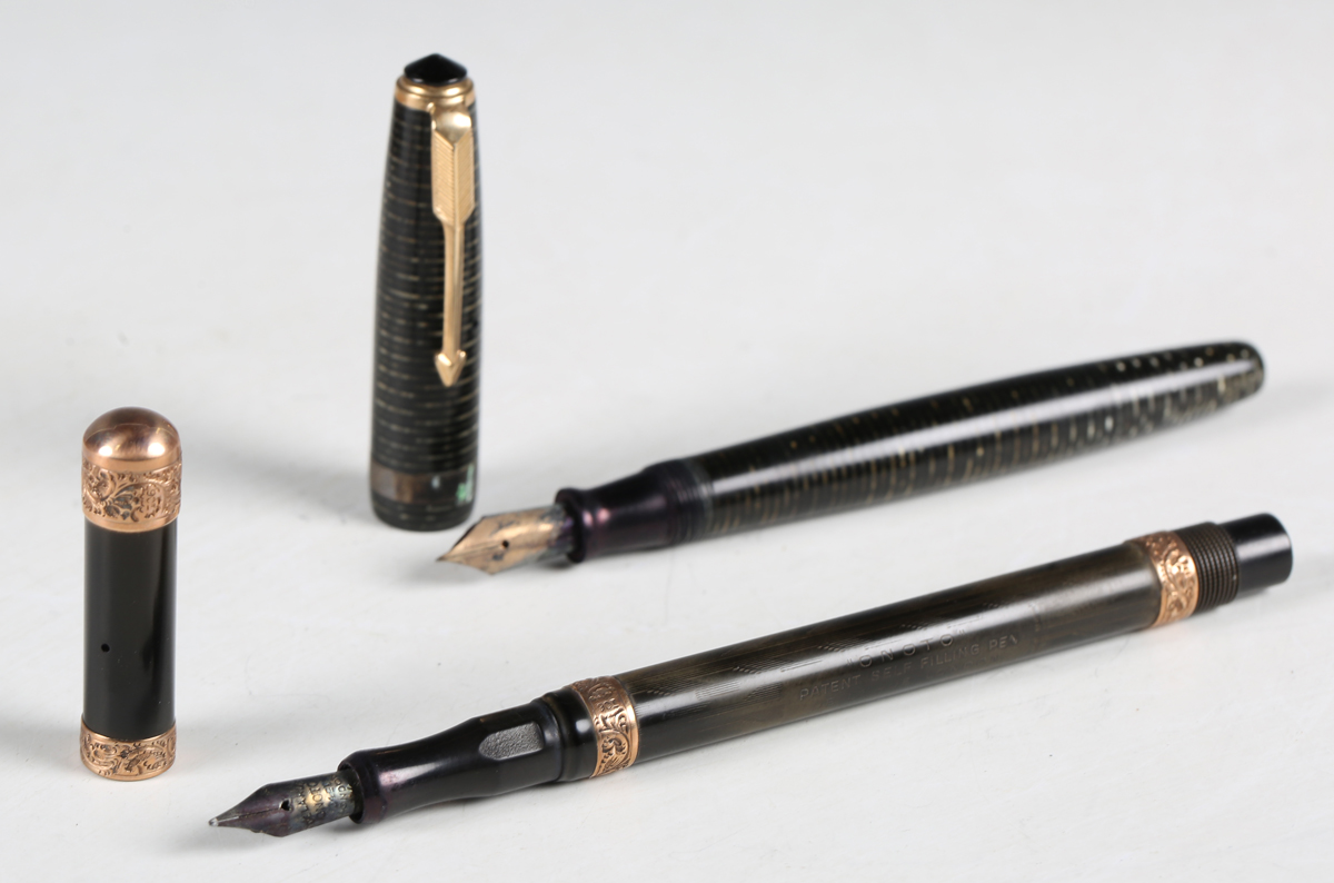 An Onoto Patent self-filling fountain pen with 9ct gold mounts, length 14.3cm, cased, together with a Parker Vacumatic fountain pen.
