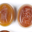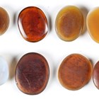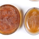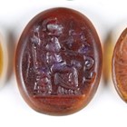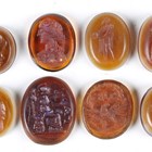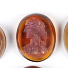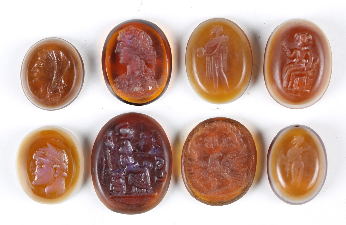 A group of eight ancient Roman style glass intaglio seals, all engraved with various figures and bust portraits, length of largest 2.4cm.