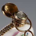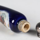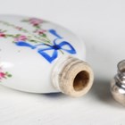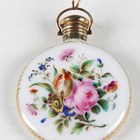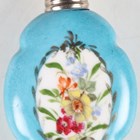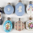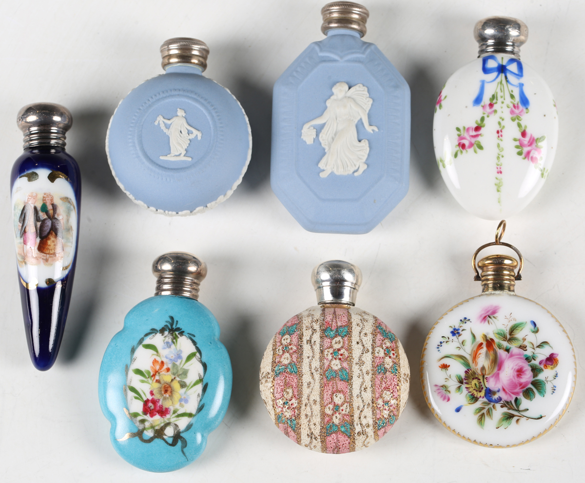 An Edwardian porcelain and silver mounted scent bottle, the shaped oval body painted with flowers, Birmingham 1906 by Robert Pringle, length 6cm, together with six other porcelain scent bottles.