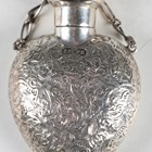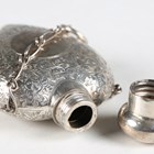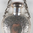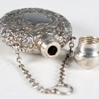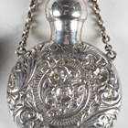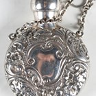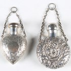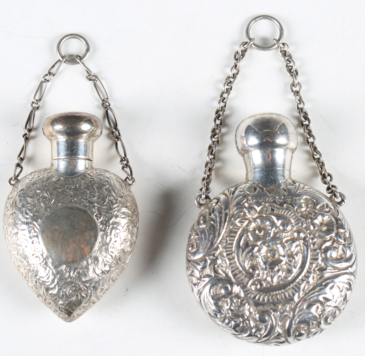A late Victorian silver heart-shaped pendant scent bottle with screw-off lid and suspension chain, the body with overall foliate chased surface, by Saunders & Shepherd, length 5.7cm, together with another similar scent bottle by the same maker, Chester 1900, length 6.5cm.