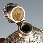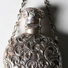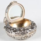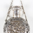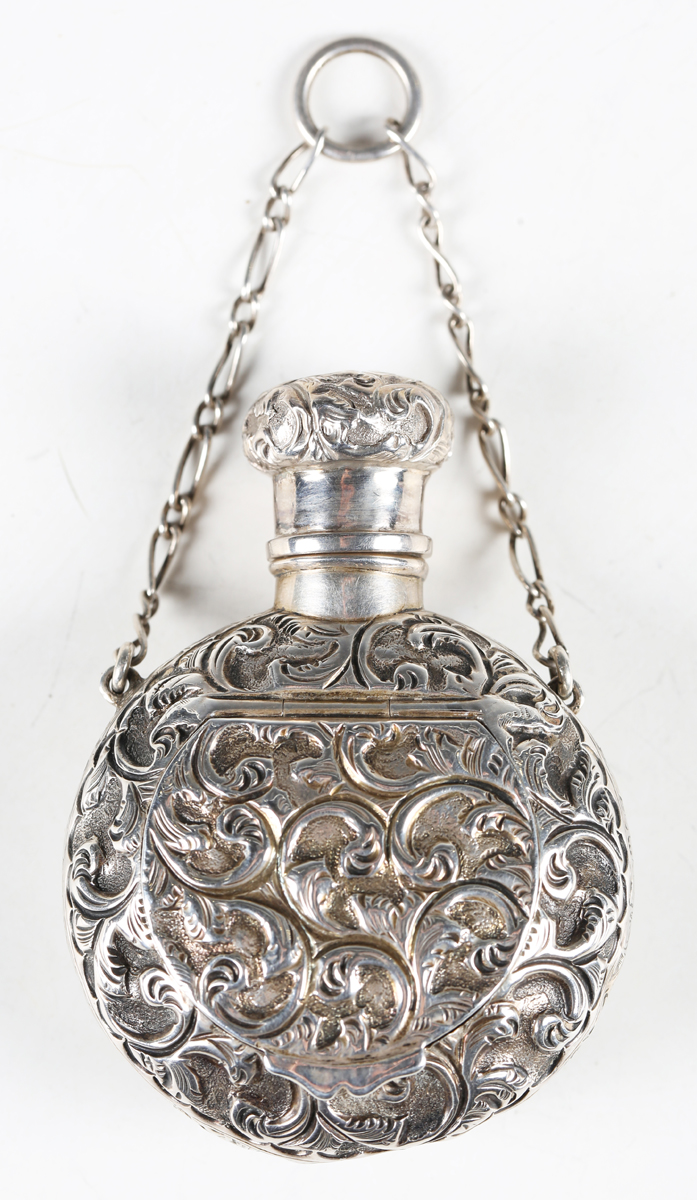 A Victorian silver combination patch box and scent bottle, the hinged lid and body heavily chased with foliate scrolls, one side fitted with a hinged lid inset with a mirror, Chester 1890 by Saunders & Shepherd, length 6.5cm.