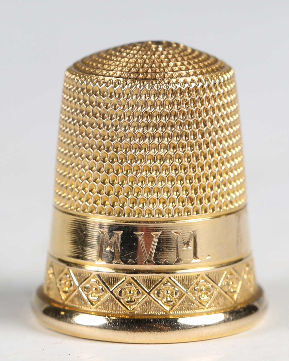 An American gold thimble, detailed with initials and size number '12', weight 6g.
