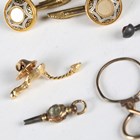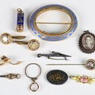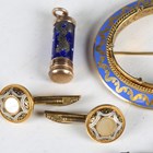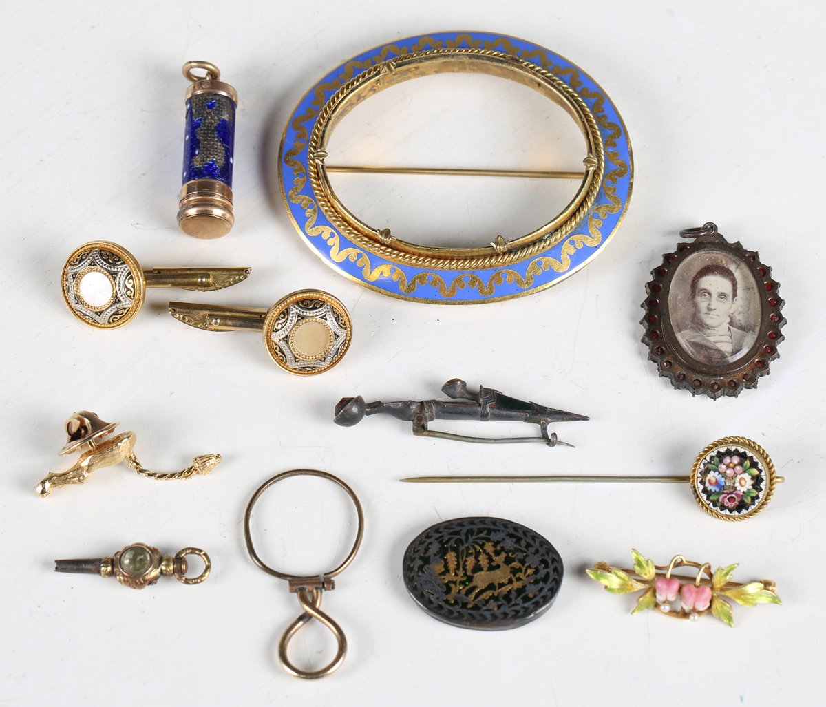 A late 19th century gilt metal and blue enamel fob propelling pencil, length 3cm, a late 19th century gilt metal and blue enamel oval frame with brooch fitting, length 6.3cm, a pair of gilt metal and enamel cufflinks and a small group of other bijouterie.