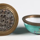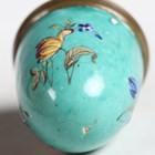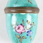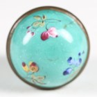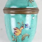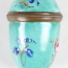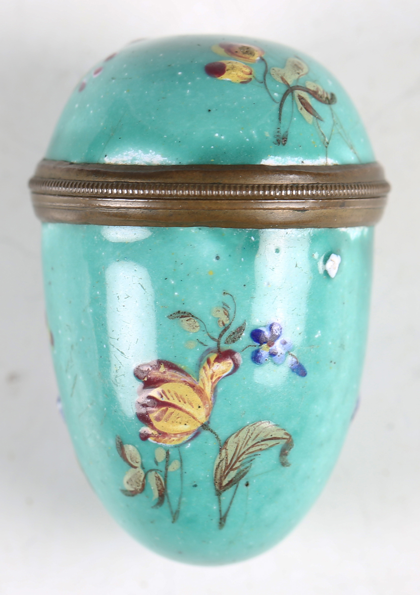 A mid-18th century South Staffordshire enamel nutmeg grater in the form of an egg, the exterior painted with floral sprays on a turquoise ground, length 4cm.