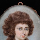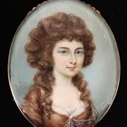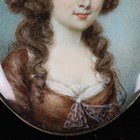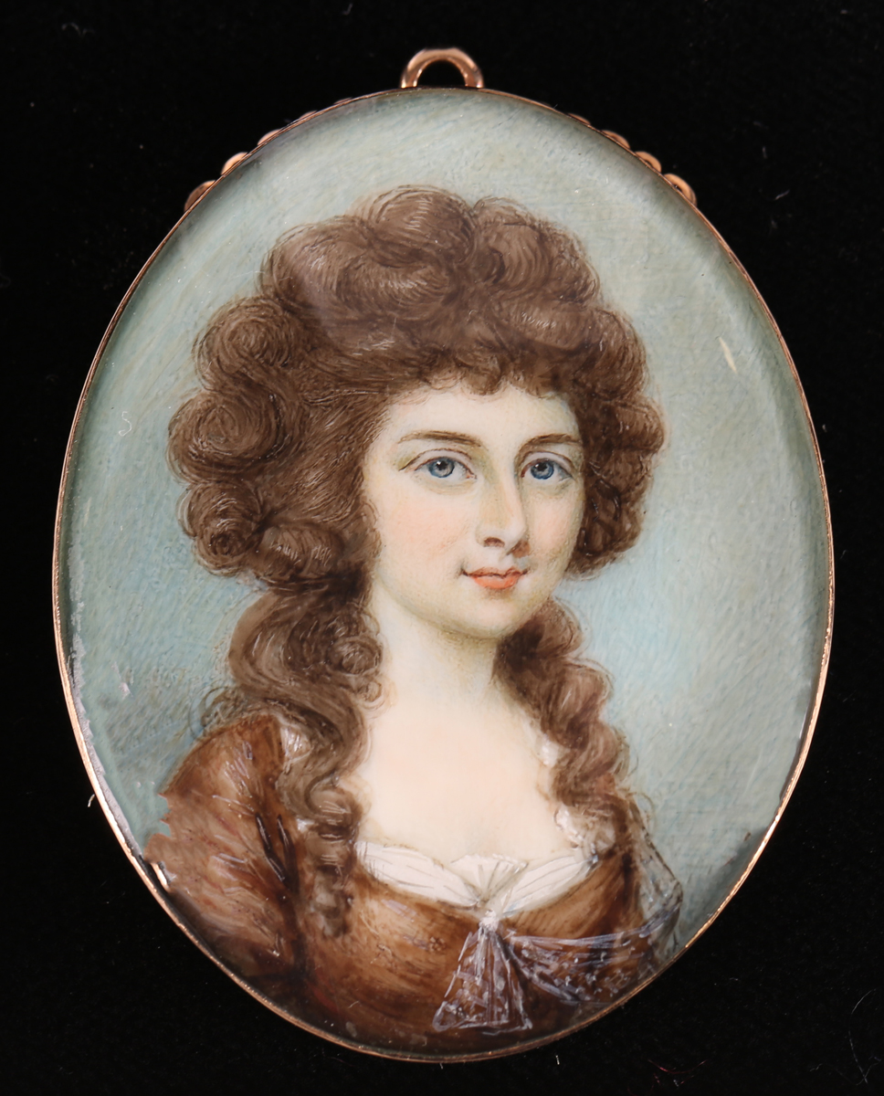 A late 18th century British School watercolour on ivory portrait miniature of a lady wearing a lace-trimmed brown dress, mounted within a yellow metal pendant frame, 5.3cm x 4cm. Note: a non-transferrable ivory exemption certificate has been granted for the sale of this item.