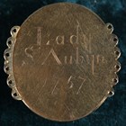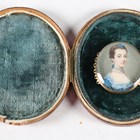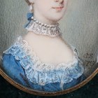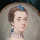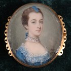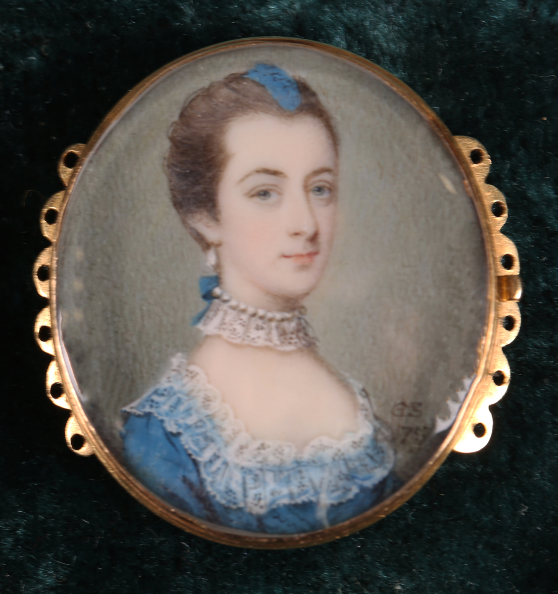 Gevase Spencer - 'Lady S'Aubyn', a mid-18th century watercolour on ivory oval portrait miniature of Lady S'Aubyn wearing a lace-trimmed blue dress, initialled and dated, the yellow metal mount inscribed to reverse 'Lady S'Aubyn 1757', 3.4cm x 3.3cm, together with a Georgian red leather case. Note: a non-transferrable ivory exemption certificate has been granted for the sale of this item.
