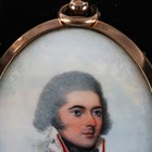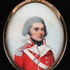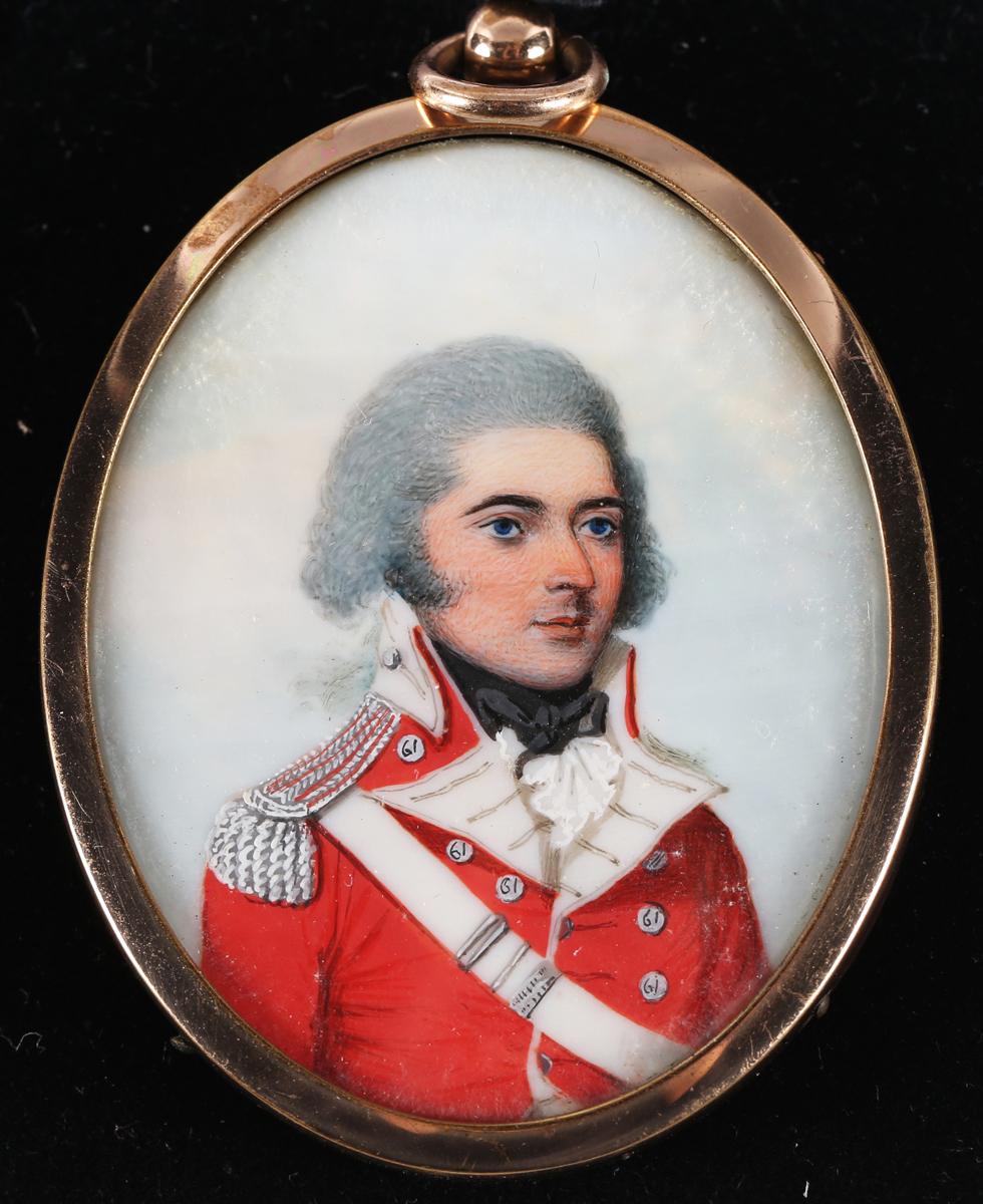 Attributed to Frederick Buck - an early 19th century watercolour on ivory oval portrait miniature of a military gentleman, thought to be Major Maurice Cane, son of Edward Cane and Mary Erskine, mounted within a gilt metal frame, 6cm x 5cm. Note: a non-transferrable ivory exemption certificate has been granted for the sale of this item.