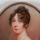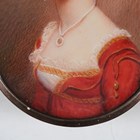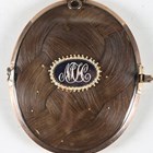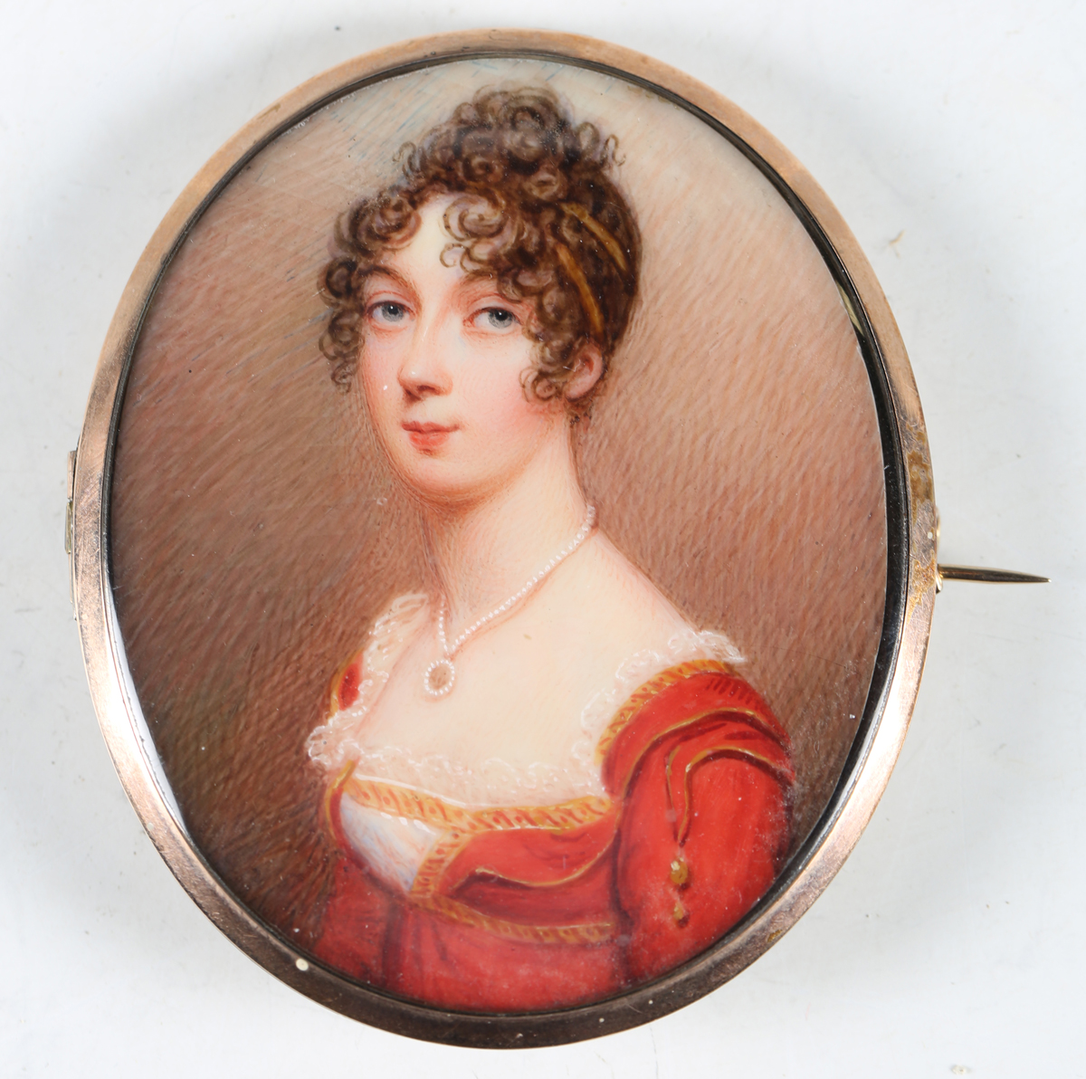 An early 19th century British School watercolour on ivory oval portrait miniature of a young lady wearing a pendant necklace and red dress, the gilt metal frame with enamelled and seed pearl inset woven hair locket to reverse, 7.5cm x 6.3cm. Note: a non-transferrable ivory exemption certificate has been granted for the sale of this item.