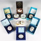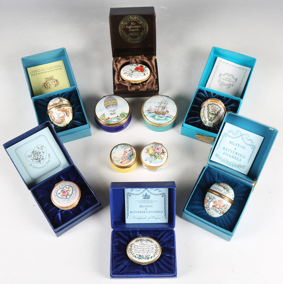 A group of ten Halcyon Days enamel boxes, including three eggs, some boxed.