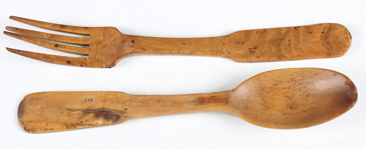 An 18th/19th century North European carved maple matching fork and spoon, length 21cm.