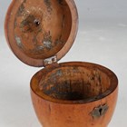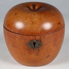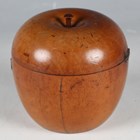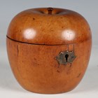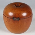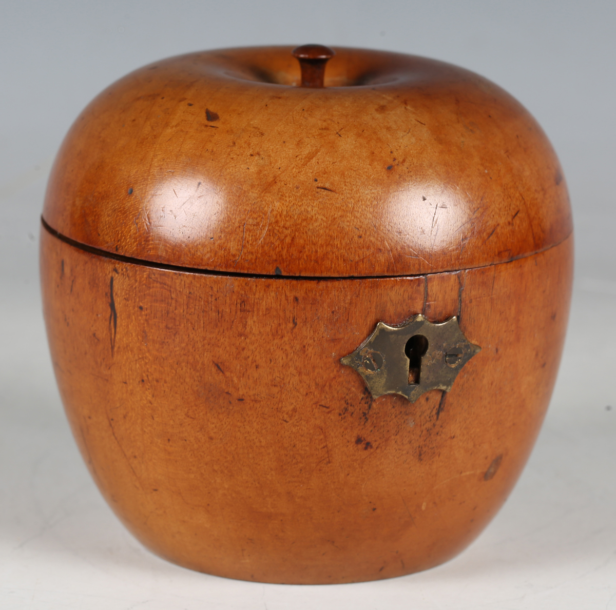 A George III turned apple tea caddy, the hinged lid with carved stalk finial, the front with brass key escutcheon, height 10cm, width 11cm.