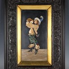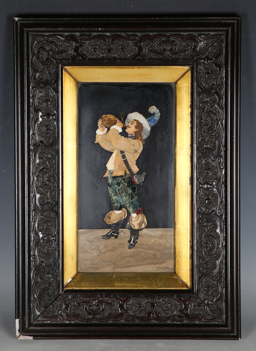 An early 20th century Italian pietre dure panel, inlaid in various marbles and hardstone with a cavalier drinking from a bottle, 25cm x 12.5cm, framed.
