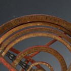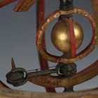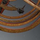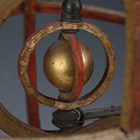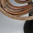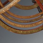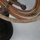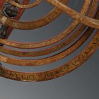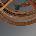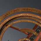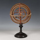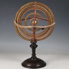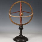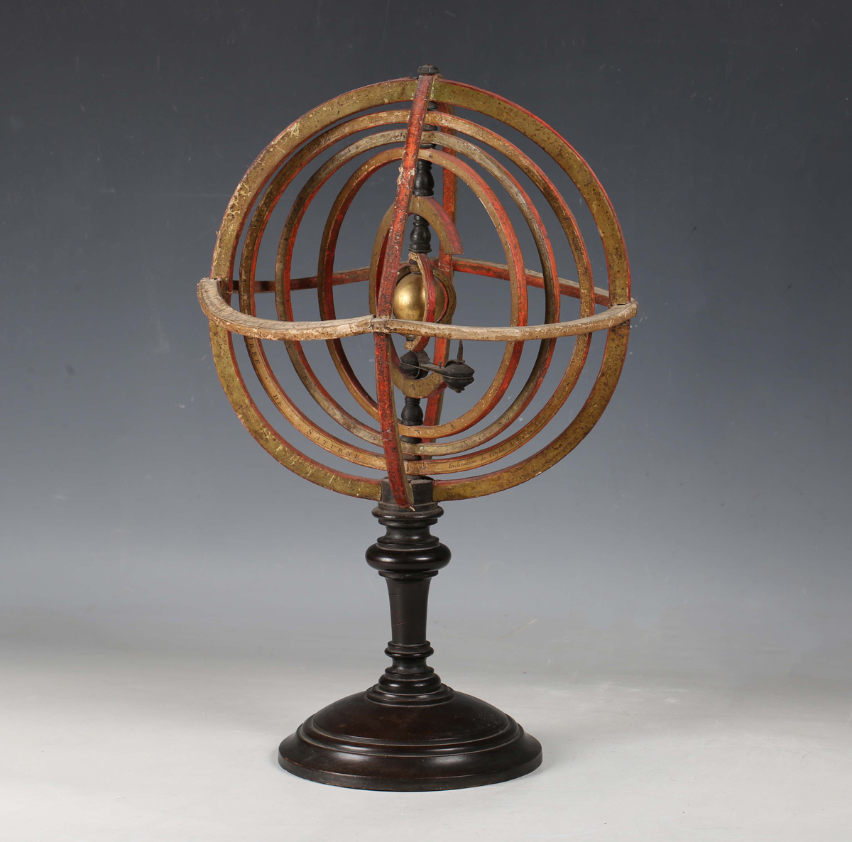 An 18th century French armillary sphere, the central giltwood orb set within a surround of four revolving frames and outer frame, all with inscribed paper panels, raised on a turned wooden pedestal base, height 42cm.