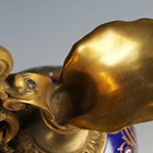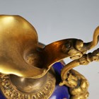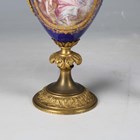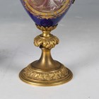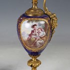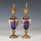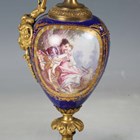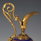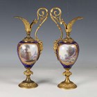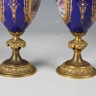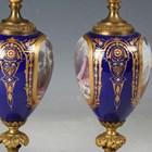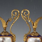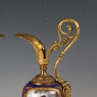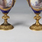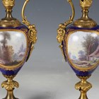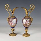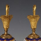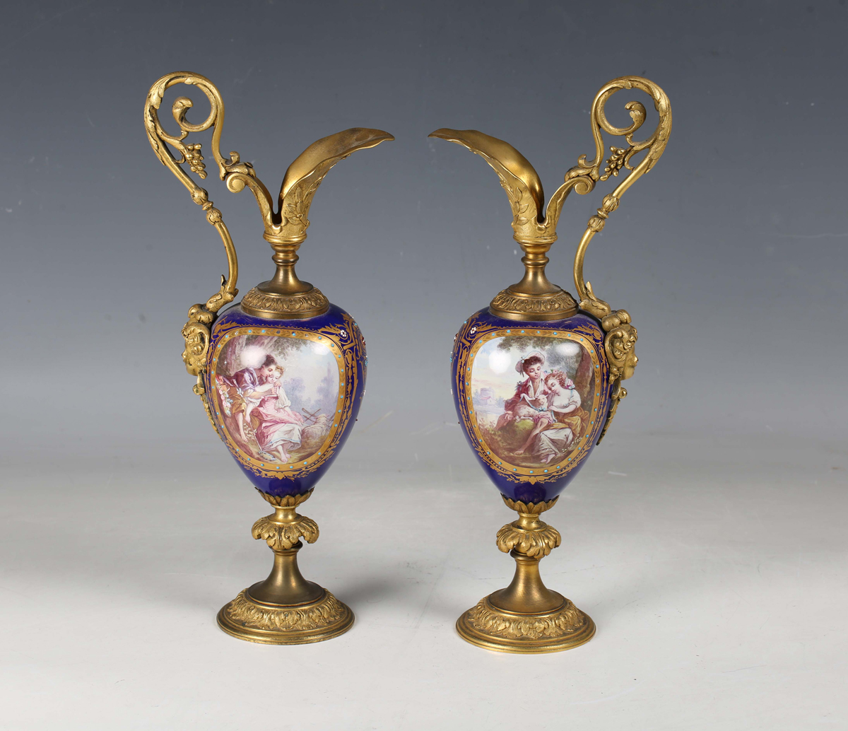 A pair of late 19th century French Sèvres style ormolu and porcelain ornamental ewers, each ovoid body painted with reserves of figures and landscapes on a blue ground, height 32cm.