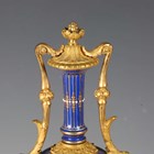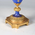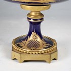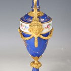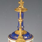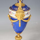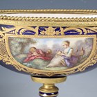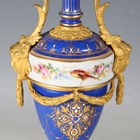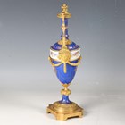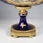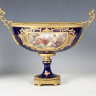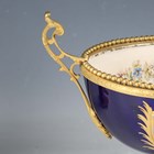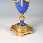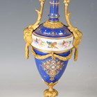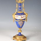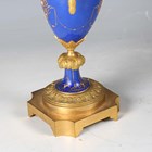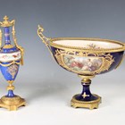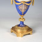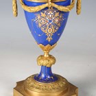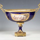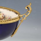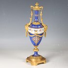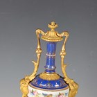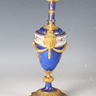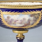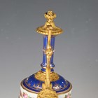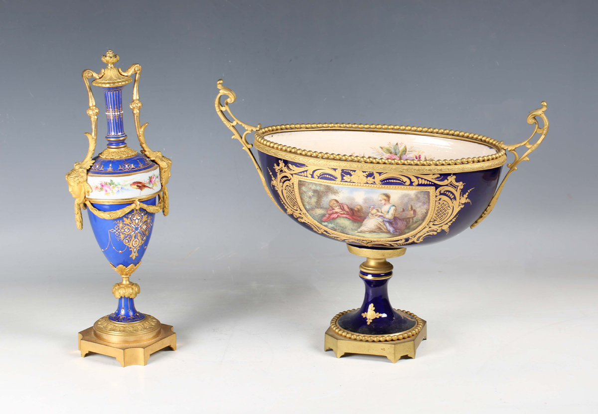 A late 19th century French Sèvres style gilt metal mounted porcelain oval centrepiece bowl, the body painted with a reserve panel of two courting figures, signed 'Bertram', width 35.5cm, together with a similar porcelain and gilt metal mounted ornamental urn, height 33cm.