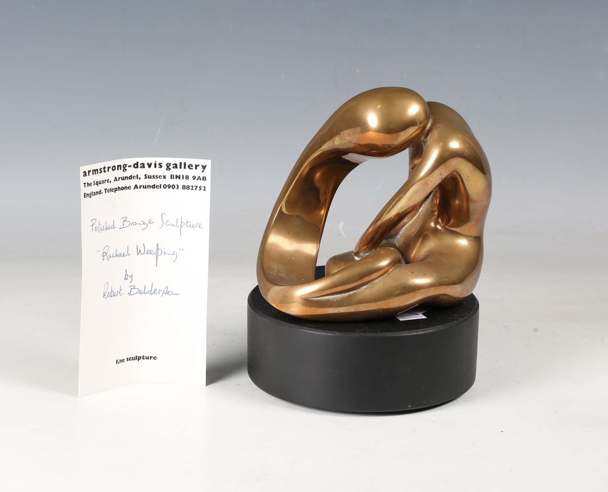 Robert Belderson - 'Rachael Weeping', a late 20th century limited edition polished bronze abstract figure, bearing initials and numbered '1/10' to underside, height 14.5cm, raised on a black revolving display pedestal.