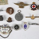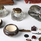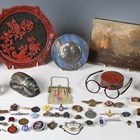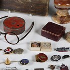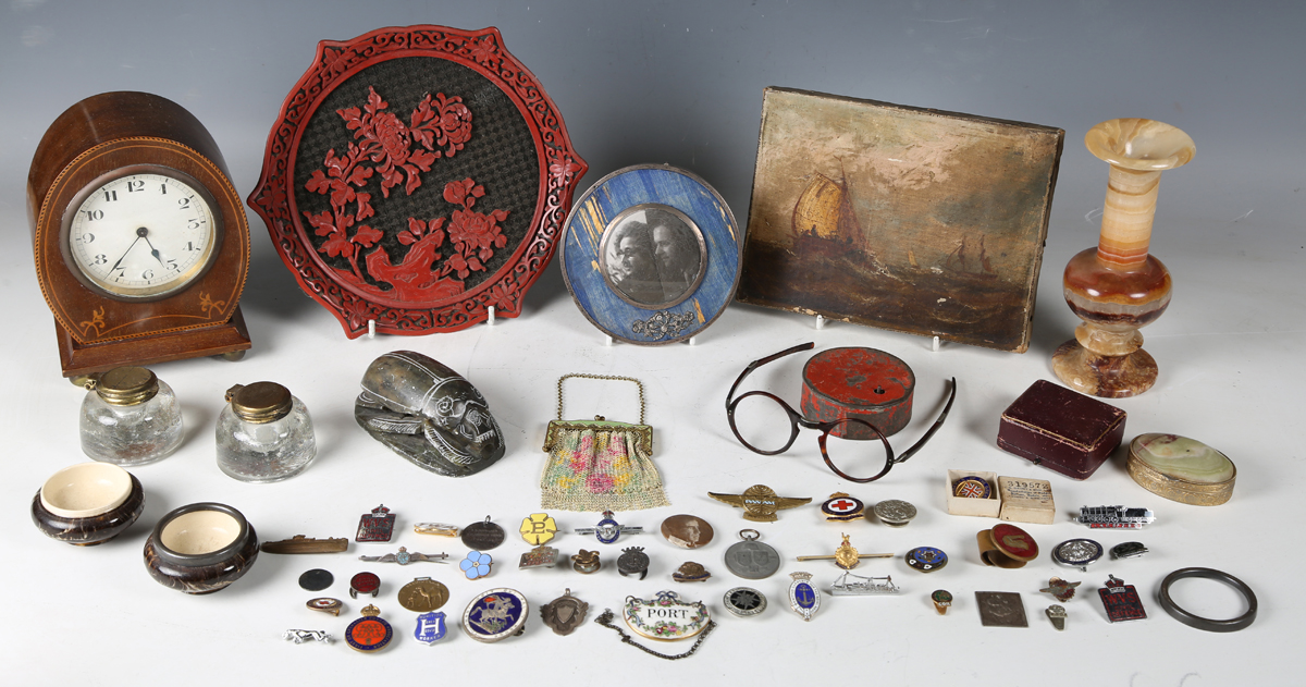 A mixed group of collectors' items, including a silver mounted photograph frame, diameter 12.5cm, a cinnabar lacquer dish, a pair of glass inkwells and various pin badges.