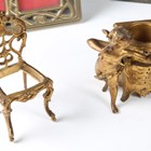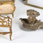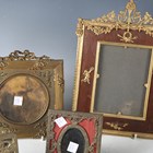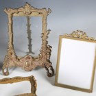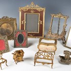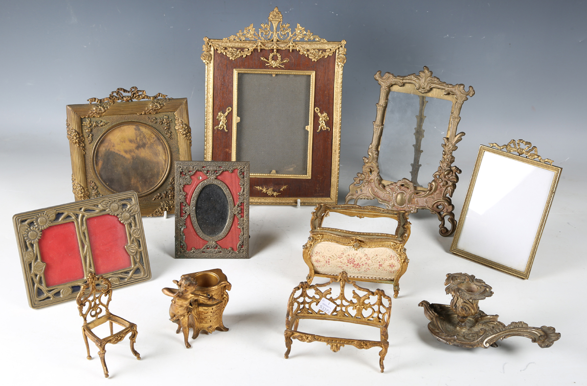 A group of mainly 20th century decorative metalwork, including six photograph frames, a rococo style chamberstick and a model settee and chair.