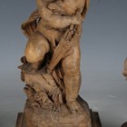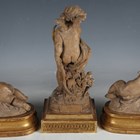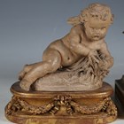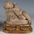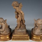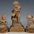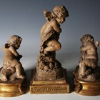 A late 18th/early 19th century garniture of three terracotta sculptures, each depicting Cupid, possibly Sèvres modelled after Clodion, the first depicting a standing Cupid pulling an arrow from his quiver, height 24cm, the other two modelled as a sleeping Cupid and a Cupid aiming an arrow, these two with incised titles, heights 14cm, each on a carved gilt enriched wooden integral stand, inscribed applied paper labels to underside of each base.