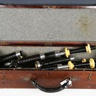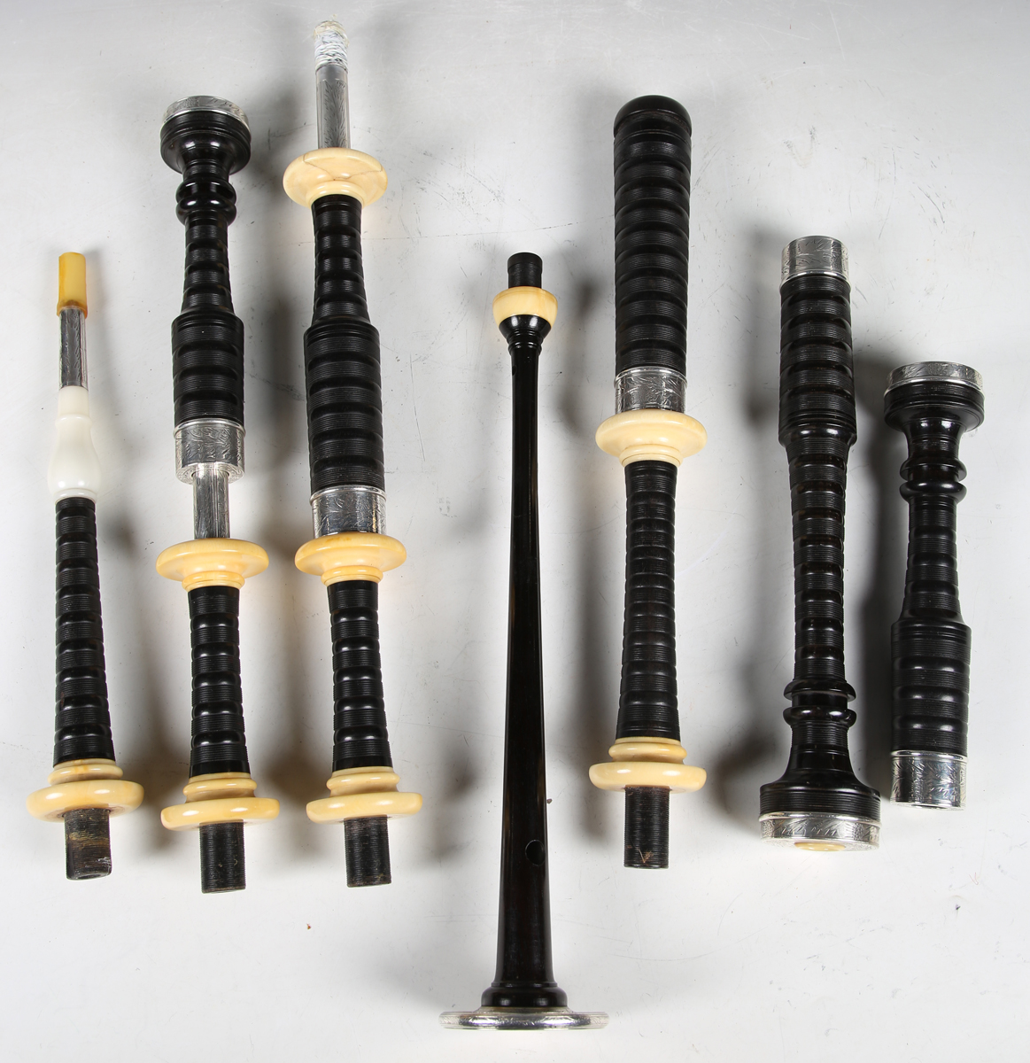 A set of late Victorian Scottish silver plate and ivory mounted bagpipes by P. Henderson, the plated mounts with overall engraved decoration and detailed 'Robert S. Edmondston, Edinburgh 1898', the chanter with stamped maker's mark, within a mahogany case. Note: a non-transferrable ivory exemption certificate has been granted for the sale of this item.