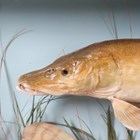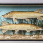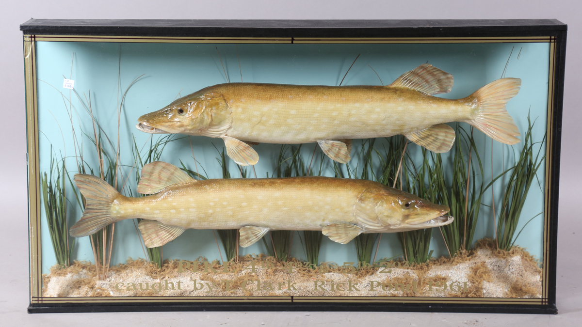 A mid-20th century taxidermy group of two pikes, the glazed case detailed 'Pike 4lb 4oz & 3lb 2oz caught by T. Clark Rick Pond 1961', width of case 97cm.