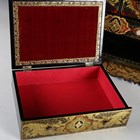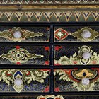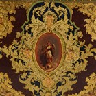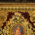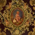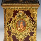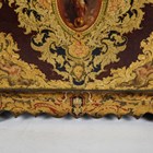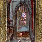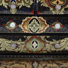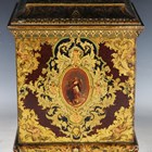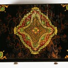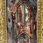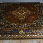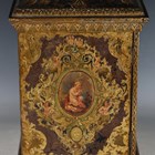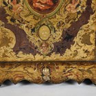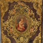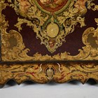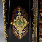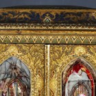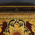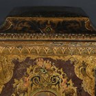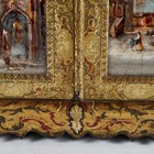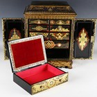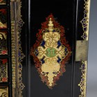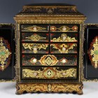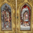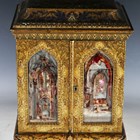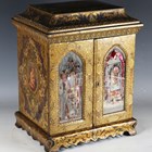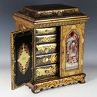 An impressive early Victorian papier-mâché table-top cabinet, the exterior profusely gilt and painted with foliage and figures, the two doors inset with glazed and mother-of-pearl inlaid panels depicting cathedral interiors, the interior fitted with drawers and a pull-out writing surface, height 38cm, width 29cm.