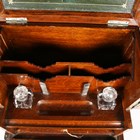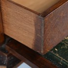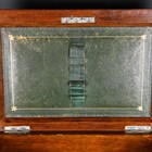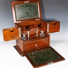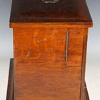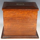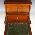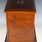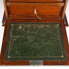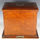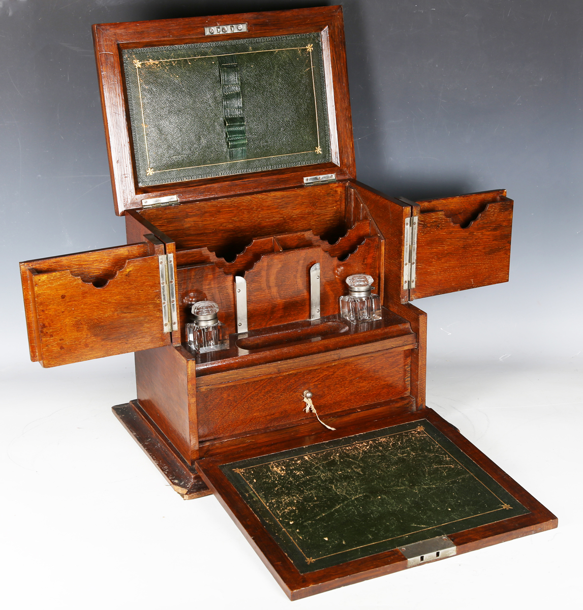 An Edwardian oak desktop stationery box, the hinged lid and fall front enclosing a green leather-lined interior, width 40cm (some faults).