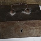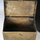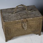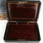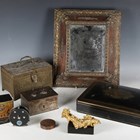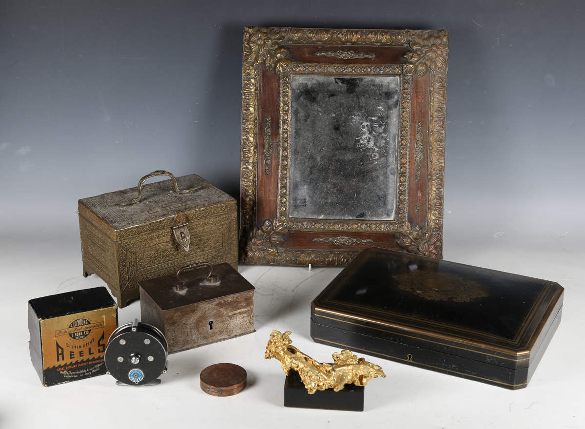 A late 19th century French ebonized and brass inlaid games box, width 32cm, together with other boxes, a small group of collectors' items and a 19th century Dutch pine and pressed brass mounted rectangular wall mirror, 38cm x 33cm.