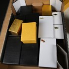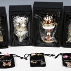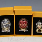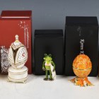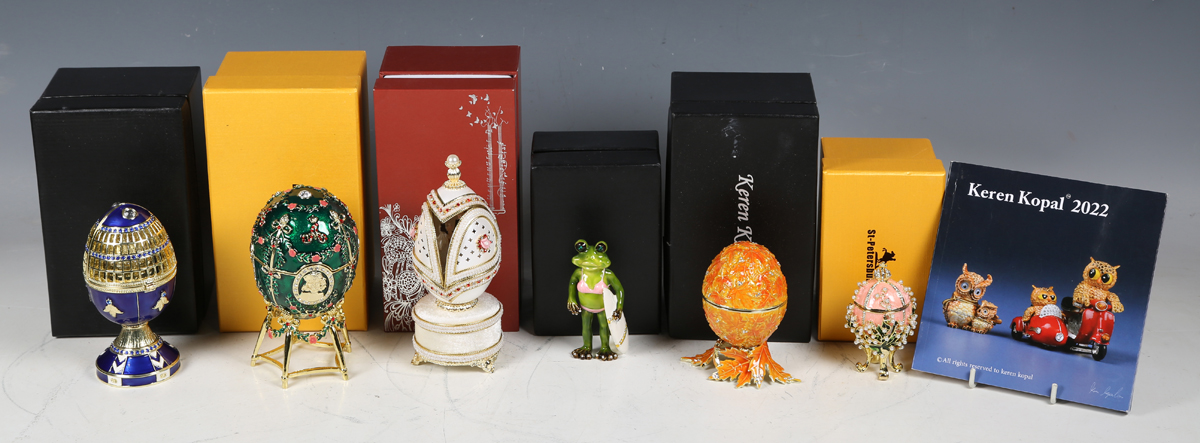 A collection of approximately thirty modern Russian-made ornaments, including Fabergé style eggs and figural boxes by Keren Kopal, all boxed.