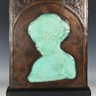 Eva Knight - an early 20th century brown and verdigris patinated cast bronze plaque, relief decorated with a head and shoulders portrait of a young girl, bearing cast signature and dated 1930 to lower left corner, 42cm x 36cm, mounted on a metal plinth.
