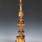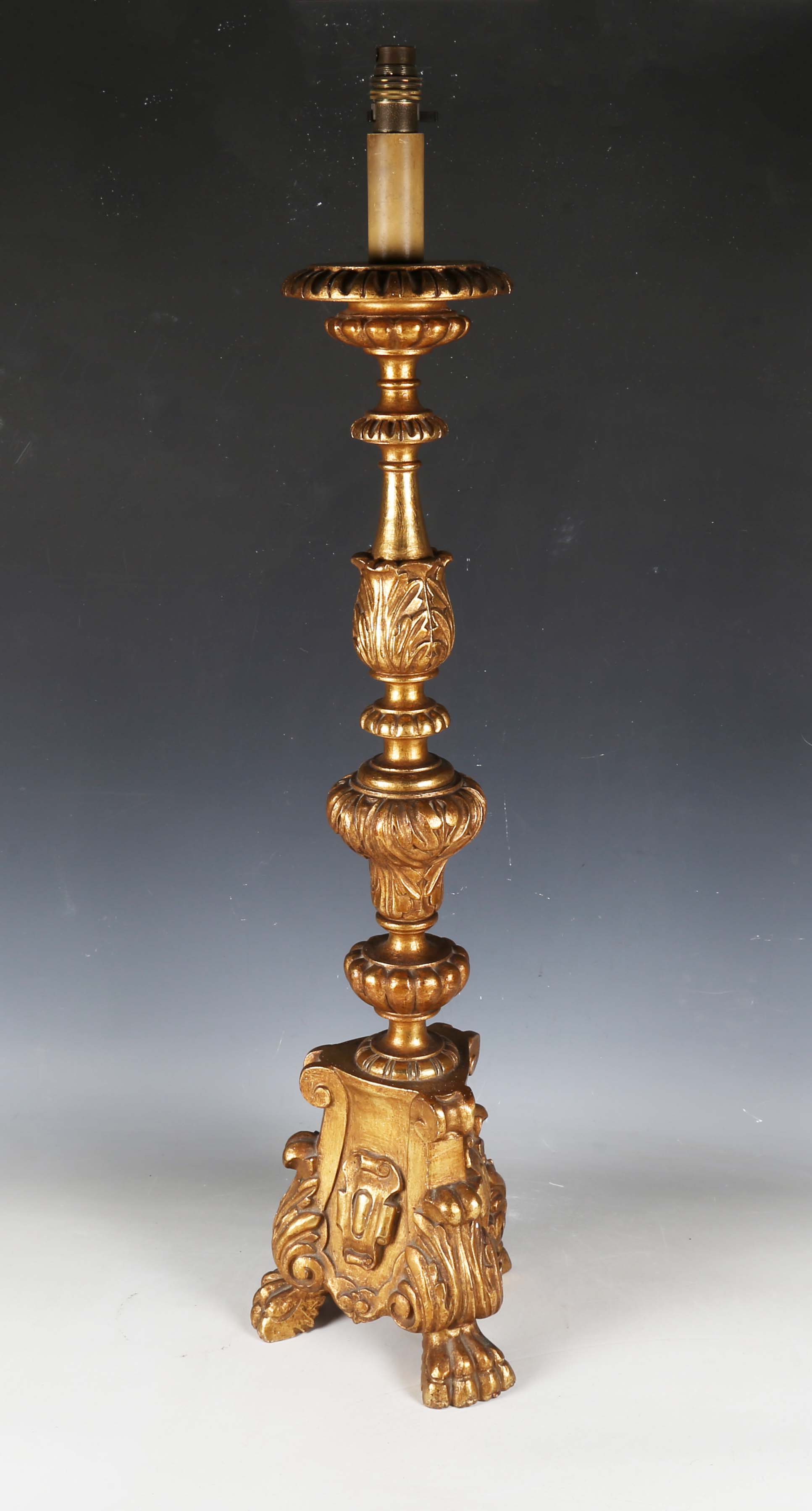 An early 20th century Italian Baroque Revival giltwood table lamp, on carved scroll legs, height 82cm.