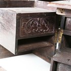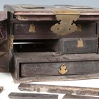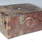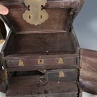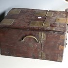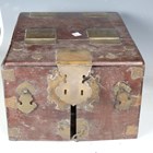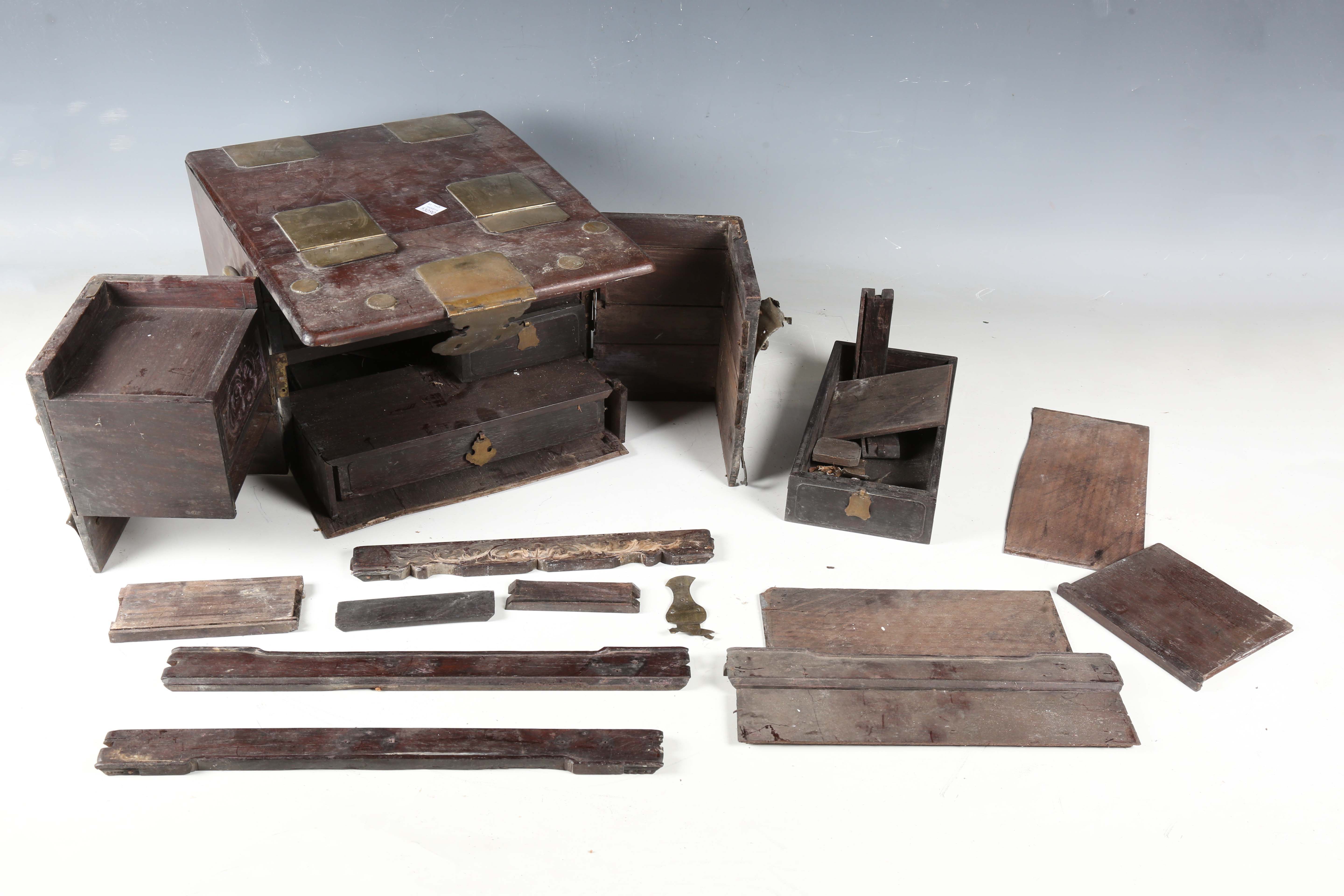 A 19th century Chinese hardwood and brass mounted dressing box, width 28cm (faults).