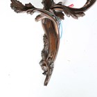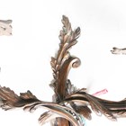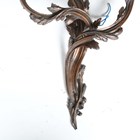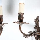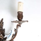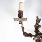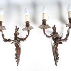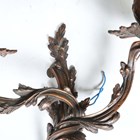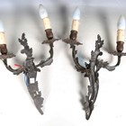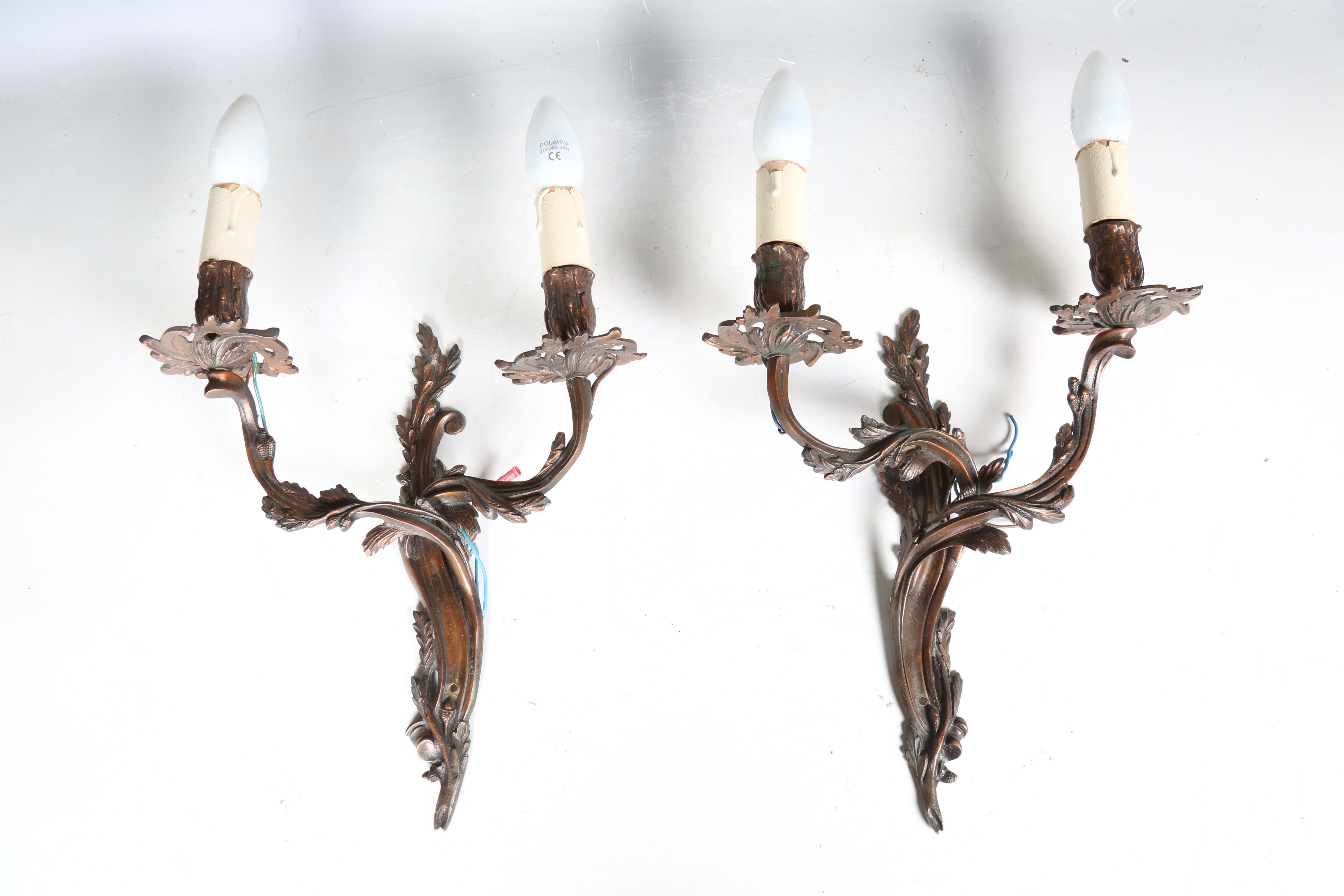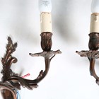 A pair of 20th century rococo style anodized cast metal twin-light wall sconces, height 30cm, together with a mid-20th century gilt metal and frosted glass ceiling light, height 47cm, and another brass ceiling light.
