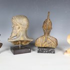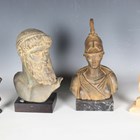 A late 19th century gilded cast spelter head and shoulders bust of Ajax, height 14.5cm, two other cast busts of classical figures and an Egyptian carved alabaster bust of Nefertiti, height 14cm.