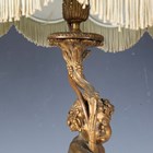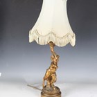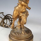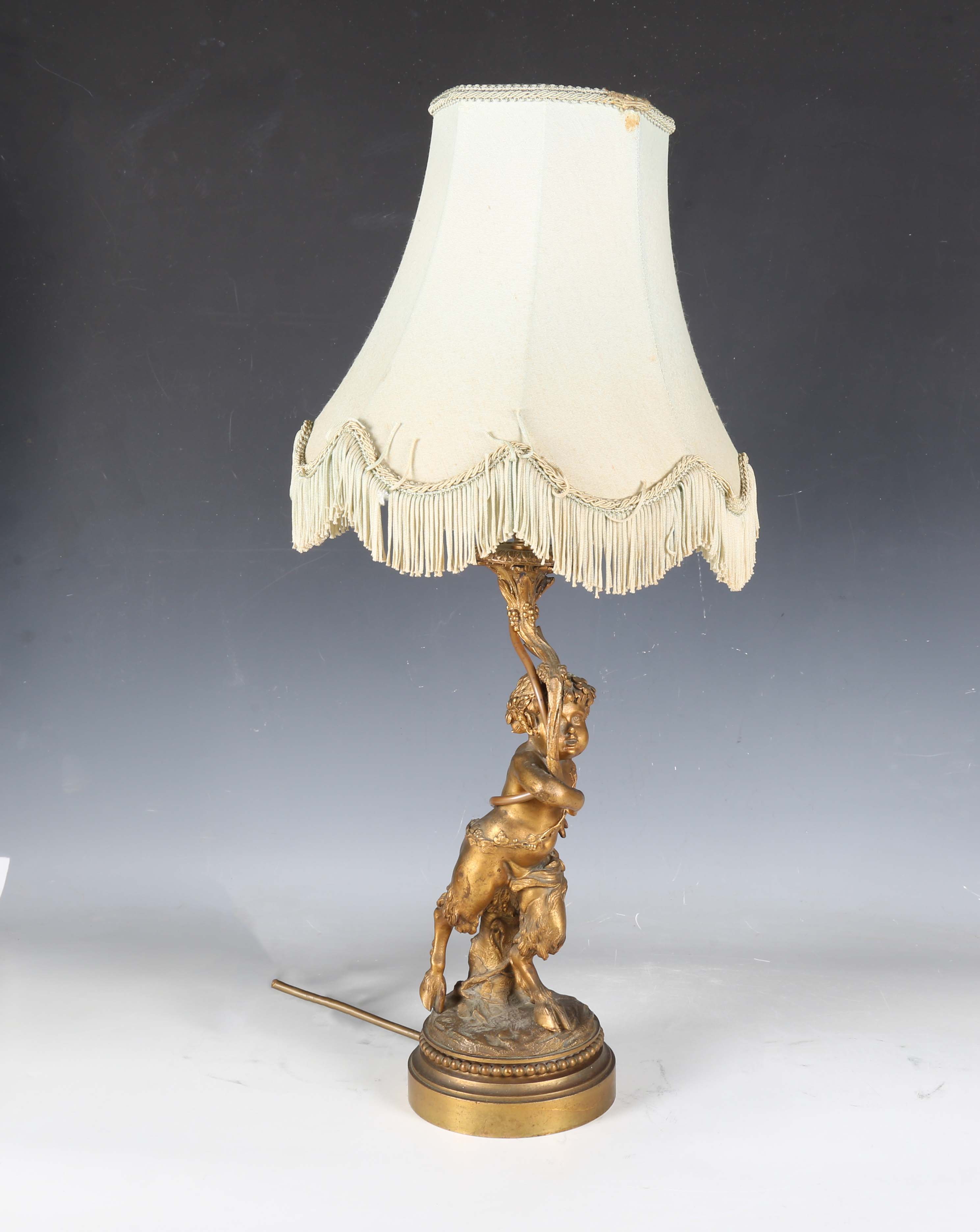 A late 19th century gilt bronze table lamp base, finely cast as a faun beside a treestump, the circular base with beaded band, height to light fitting 38cm (converted to electricity).