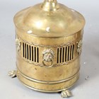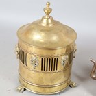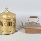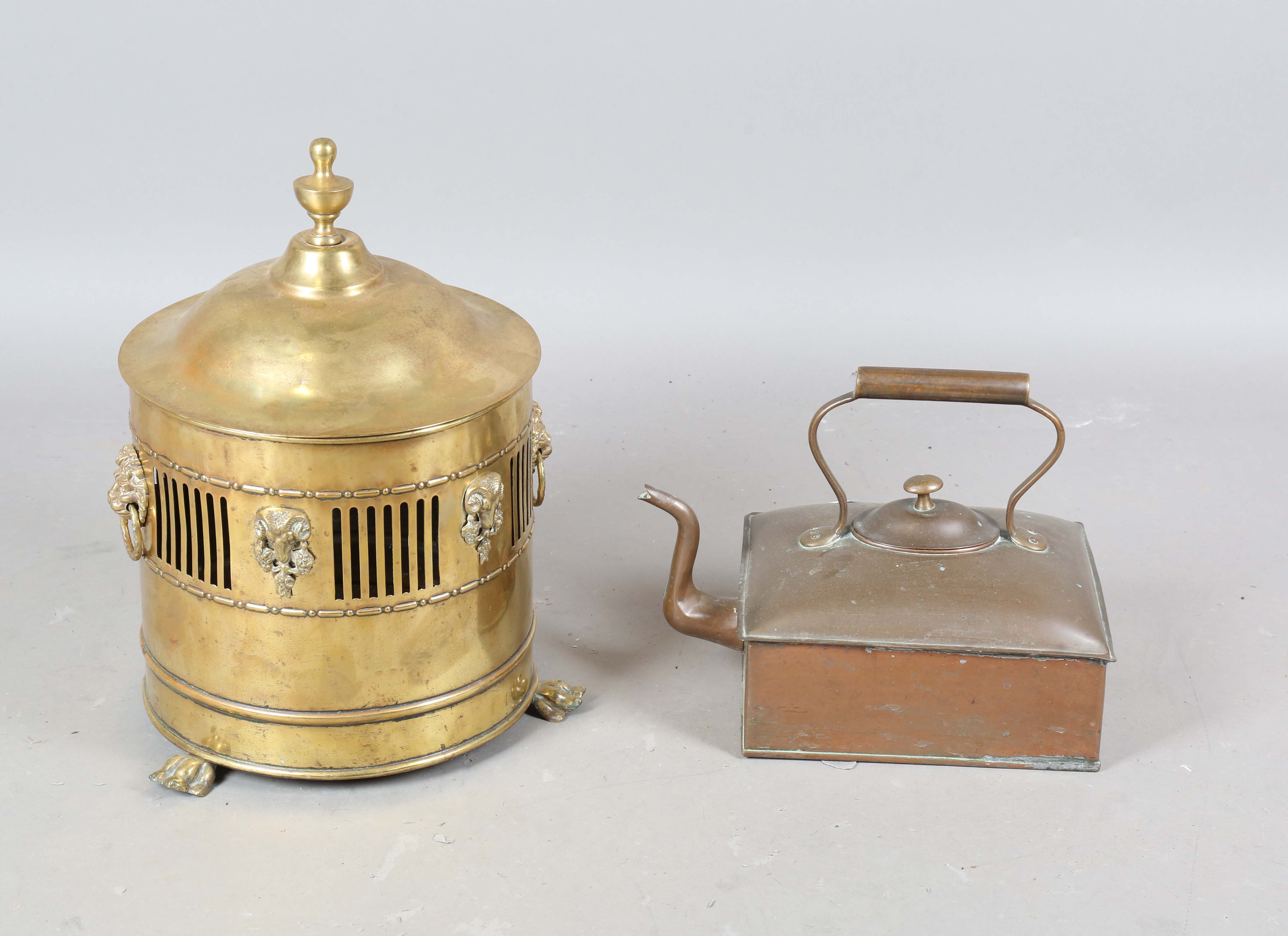 An early 20th century Neoclassical Revival brass cylindrical coal bucket and lid, height 50cm, together with a Victorian copper rectangular kettle, width 29cm.
