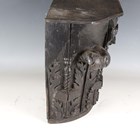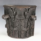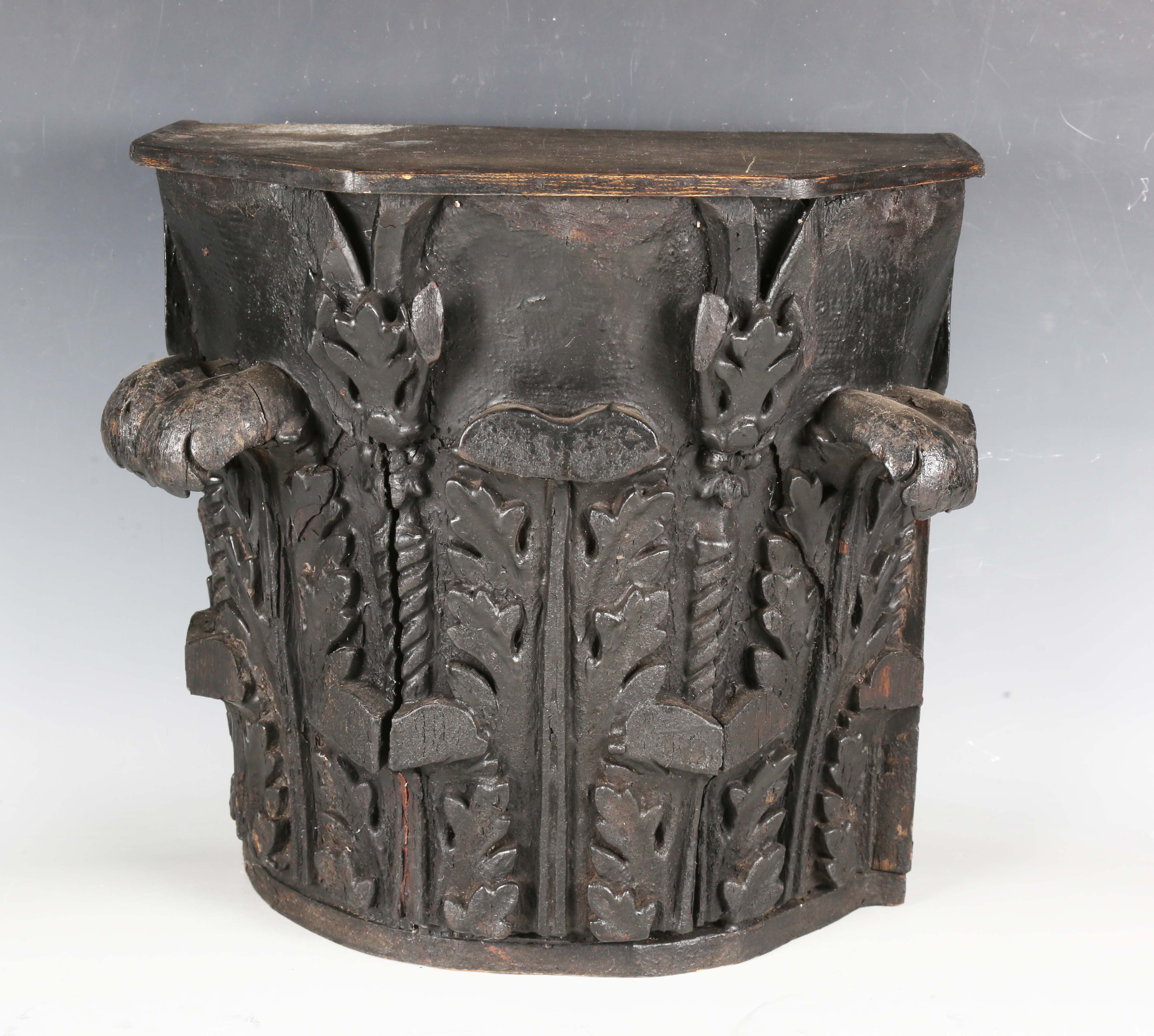 A late 19th/early 20th century carved and stained oak ornamental capital of Corinthian form, height 36cm, width 39cm.