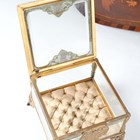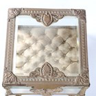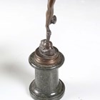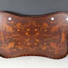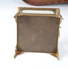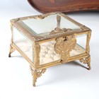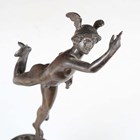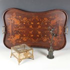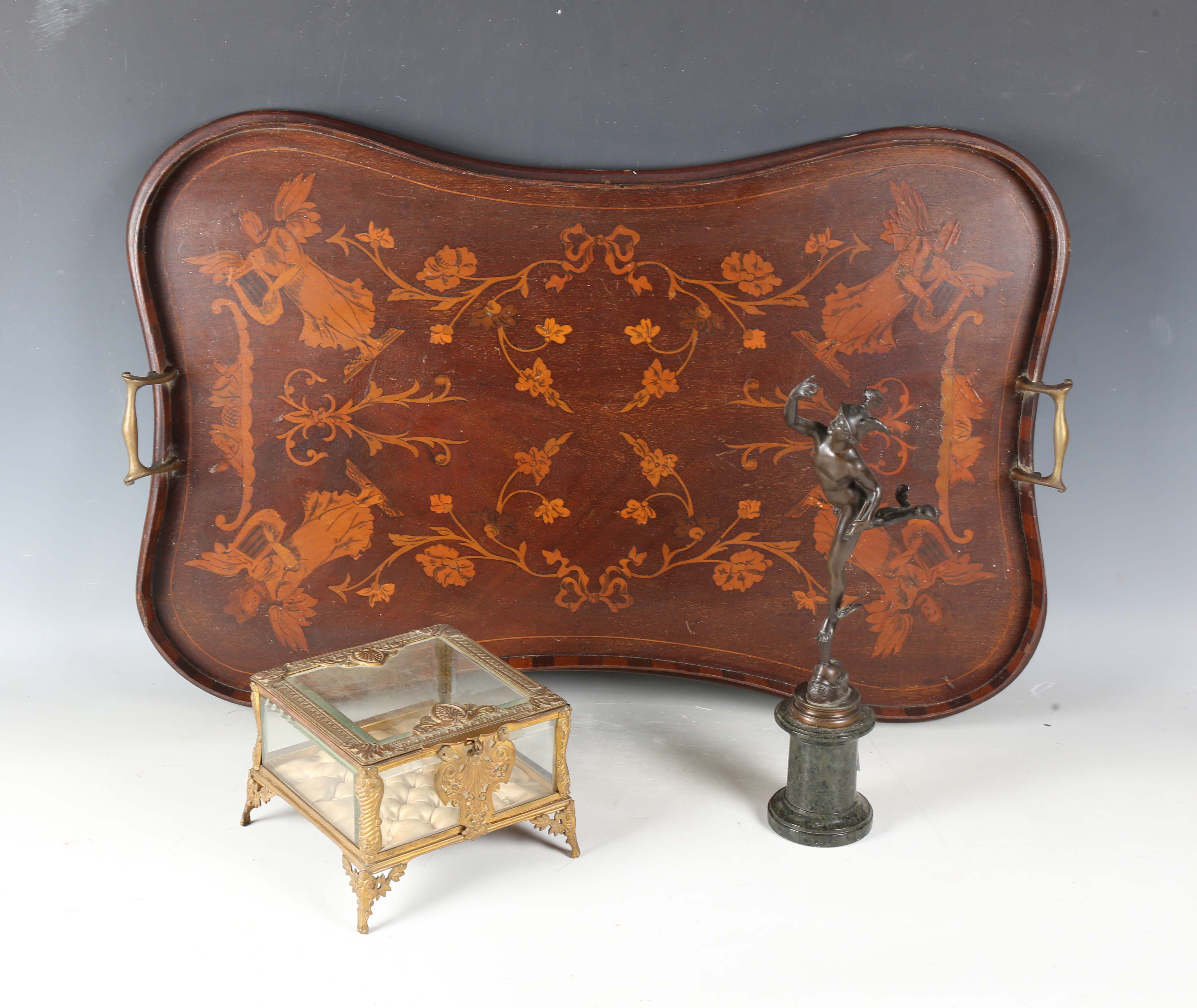 An early 20th century French gilt metal and glass bijouterie case, width 16cm, together with a cast spelter figure of Mercury, after Giambologna, height 32cm, and an Edwardian mahogany tea tray.
