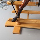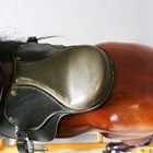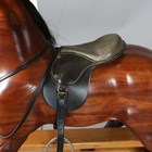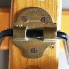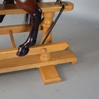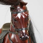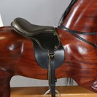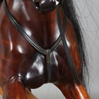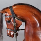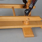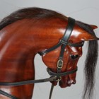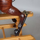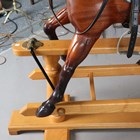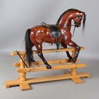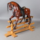 A modern carved wooden rocking horse by Harold Wakefield, Boston, England, the finely modelled body with angled posture, the ash trestle style base with maker's stamp to the brassware, height 110cm, length 133cm.