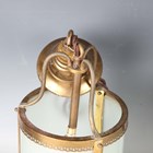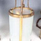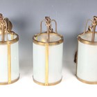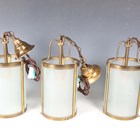 A set of three mid-20th century gilt brass and frosted glass cylindrical ceiling lanterns, height 33cm, diameter 15cm.