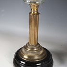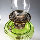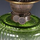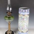 A late Victorian gilt brass and green tinted glass table oil lamp, height to burner 45cm, together with a Portuguese pottery stick stand, painted with overall flowers, height 52cm.